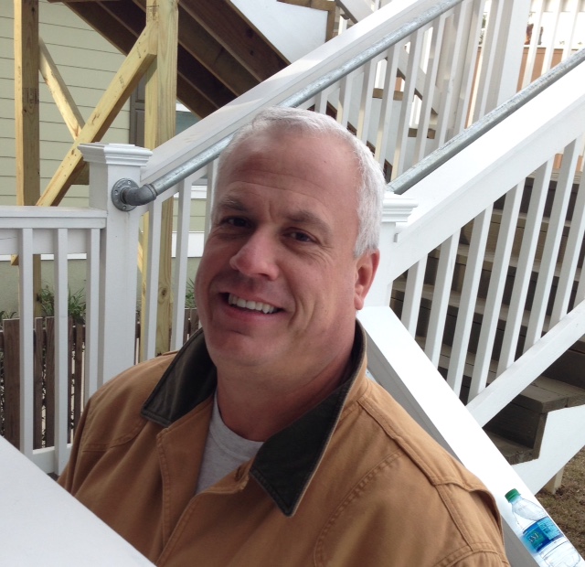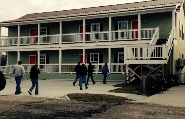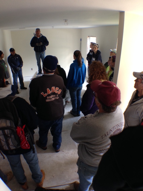 Then it’s off to Gulfport and our major undertaking, a large home for a family of seven that was extensively damaged by Hurricane Katrina — 10 years ago in August, can you believe it? The renovation was started some years ago, then was suspended for three years when both homeowners lost their jobs. Our friends from Newtown began working on the house last summer. Work for this week will include exterior and interior painting; baseboard, door and window trim cutting and painting; flooring installation, including bathroom tile if we have time; and installing light fixtures. The family is living in a rickety two-bedroom house next door while their home is being readied. Craig briefed us on the work to be done, while everyone walked through the rooms scoping out the project.