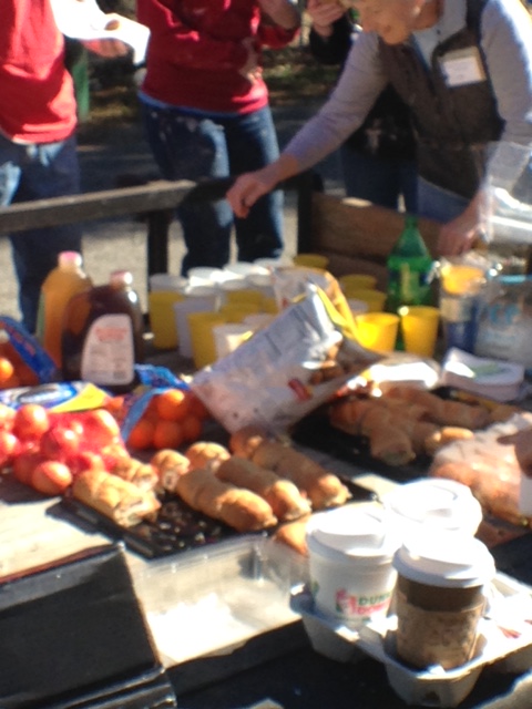 While our teammates were toiling at their respective locations, the kitchen crew began prepping for dinner. We’ve learned over the years that it’s not the actual cooking that’s time-consuming, but rather the prep; washing and drying greens and veggies for salad, peeling endless pounds of potatoes, leeks and onions for potatoes au gratin; cutting up broccoli and peppers to roast; and mixing up a glaze for the ham. All three were fully occupied till the galloping hordes returned at 4:30. Nine women-hours of prep — food gone in less than thirty minutes!