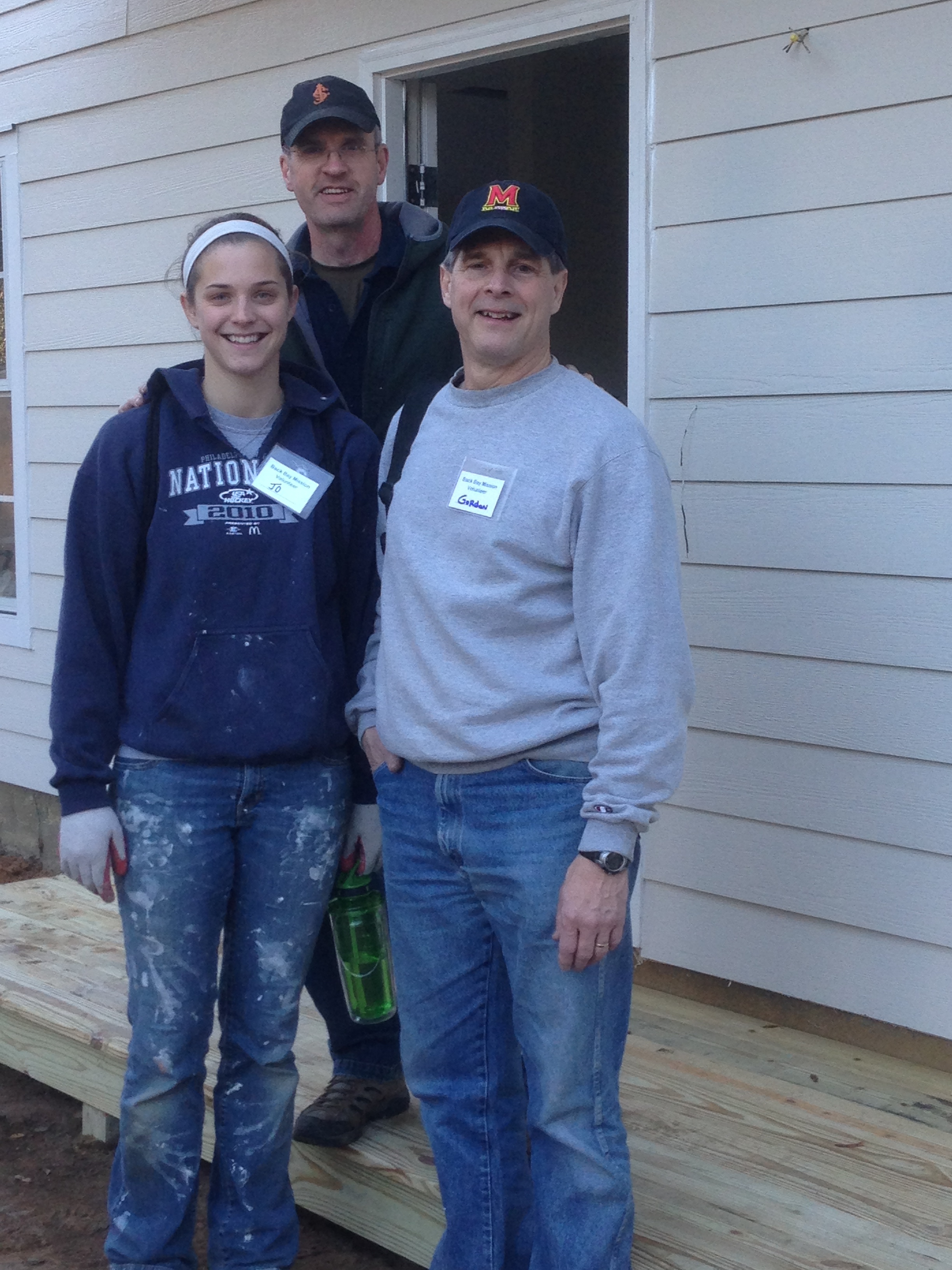 At the house on 26th & ½ Street, we framed out the master bath closets, prepped concrete floors for tile installation, and caulked around window and door frames and baseboards. Carpet was delivered, so John and Al began laying padding. We built two decks, one in back and one in front (pictured are three-quarters of the proud front deck team, who completed their project in a single afternoon).