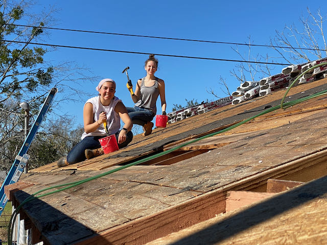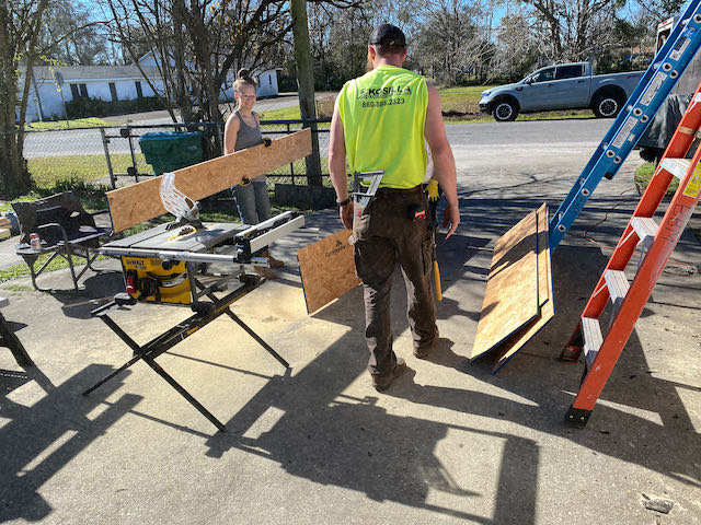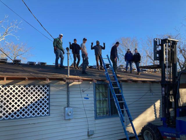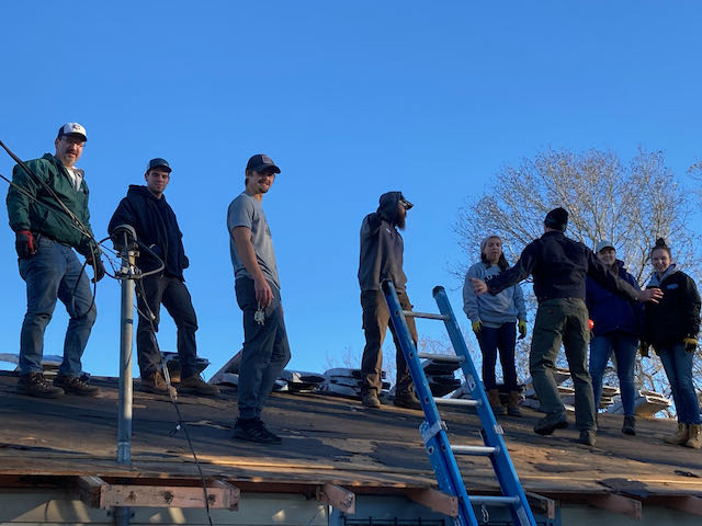 The work crew trudged in after a long day on the roof, but mustered the energy to play games tonight — including teaching Sharon how to play euchre.