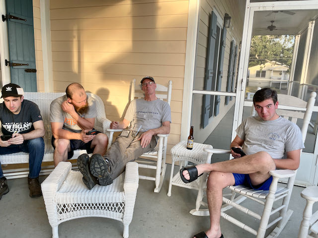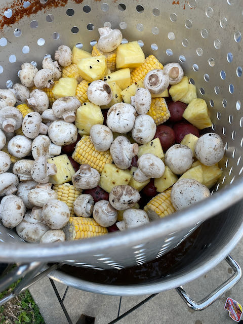 And Craig and Chance fired up the burners for the shrimp boil. Craig’s proprietary recipe includes baby potatoes, corn on the cob, mushrooms, Andouille sausage, pineapple(!) and local shrimp, all swimming in a boiling broth flavored with Zatarain’s crab and shrimp boil. Supplemented with mac and cheese and salad (for she who will remain nameless), it was a fitting feast to end a productive week.