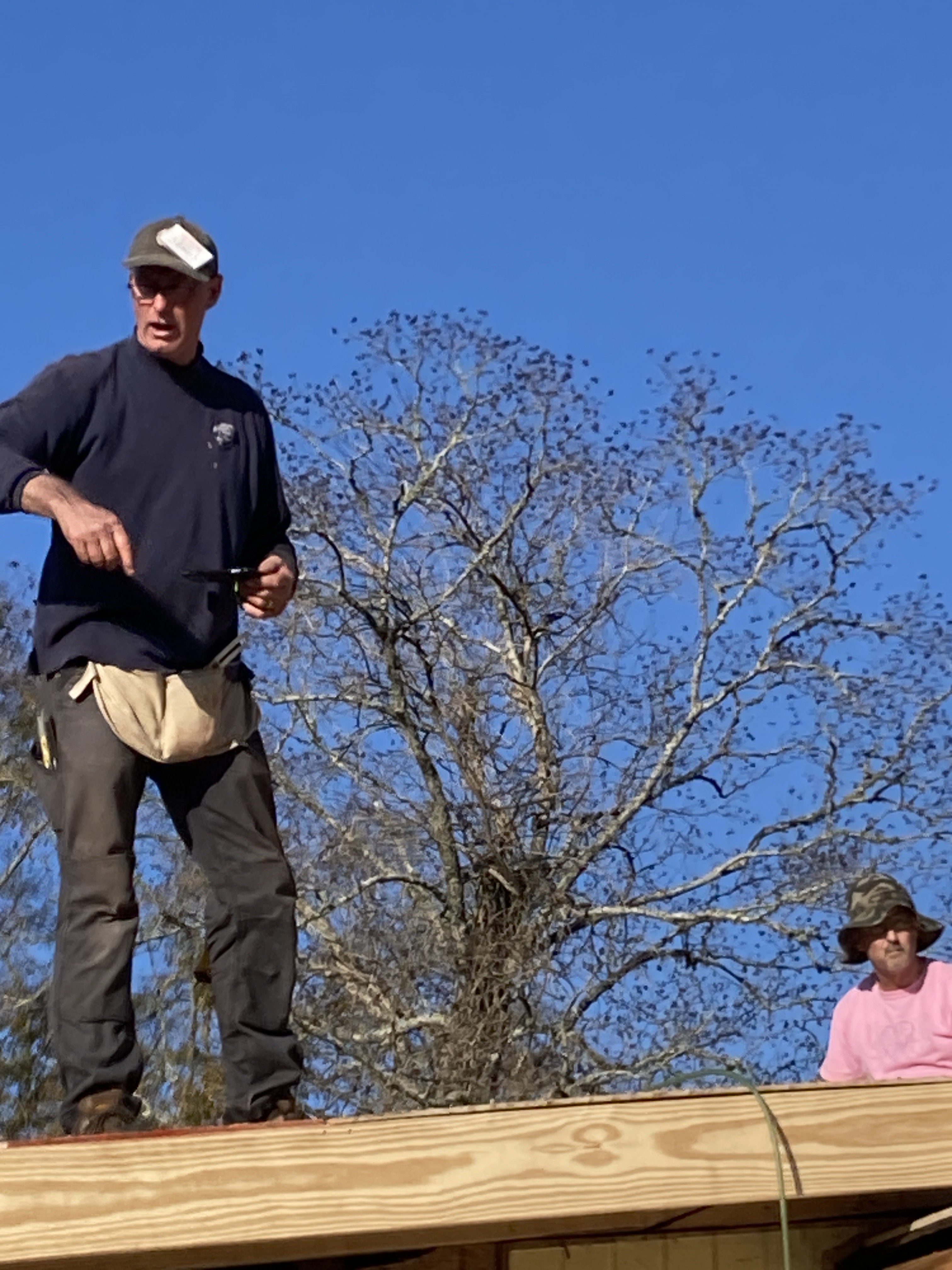 Thursday dawned bright and sunny, but thunderstorms were forecast for late morning. Jim’s crew high-tailed it back to the worksite to try to finish the roof before the rain set in.