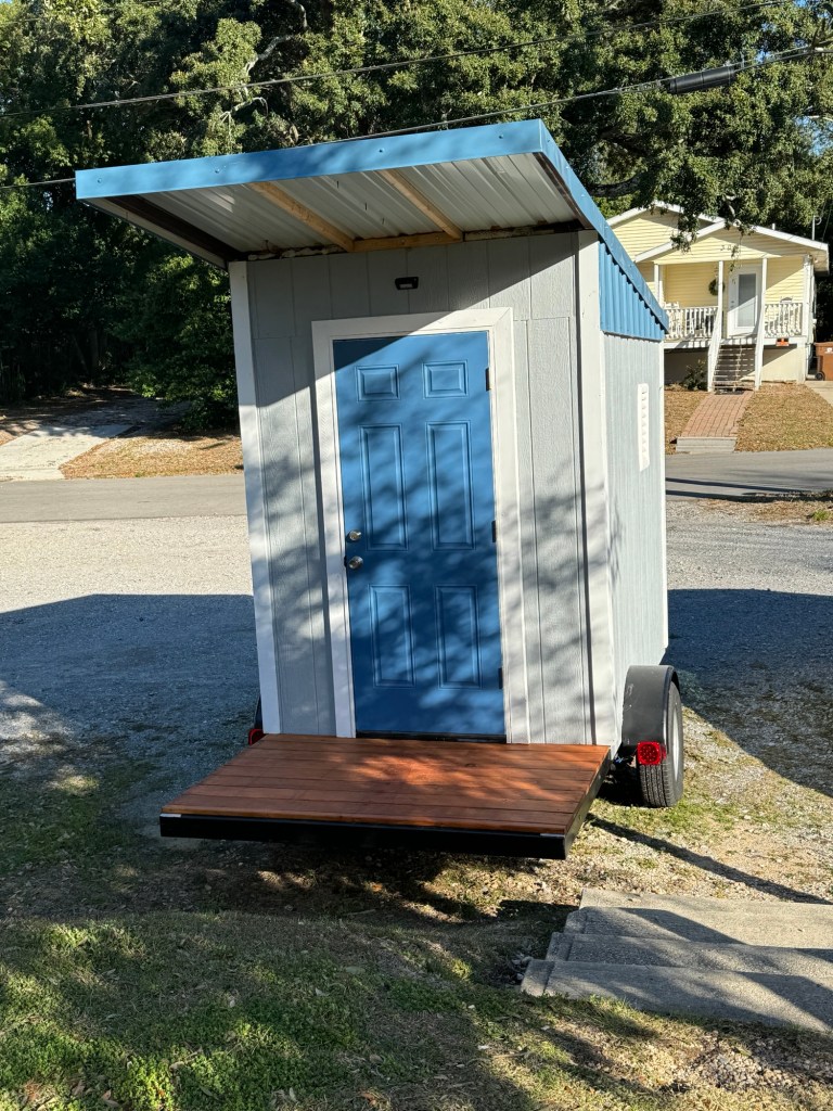 With solar-powered lights, a USB port, a single platform for a sleeping bag, and basic insulation in the floors and ceiling. It’s on wheels so it can be attached to a trailer in case evacuation is necessary.